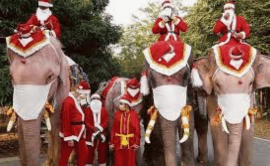 In which country do ELEPHANTS dress in Santa Claus costumes and give gifts to children?
