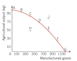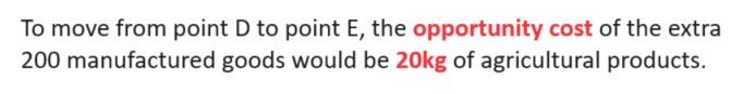To move from point D to point E, the ________ of the extra 200 manufactured goods would be _____of agricultural products.