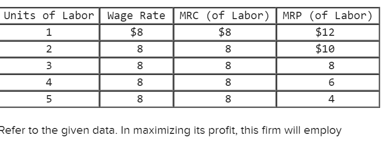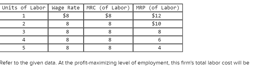 Assume labor is the only variable input and that an additional input of labor increases total output from 72 to 80 units. If the product sells for $6 per unit in a purely competitive market, the MRP of this additional worker is...