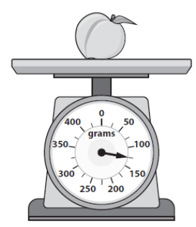 Zoey eats toast and a peach for breakfast. The mass of the toast is 25 grams. The mass of the peach is shown on the scale.