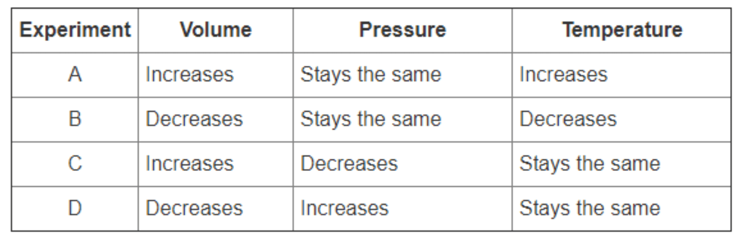 (What are experiments C and D? / or specify which experiments show inverse pressure–volume relationship)