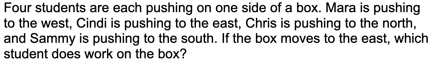 • 300 — Work is done only by the student pushing in the direction of motion; if the box moves east, this student does work.