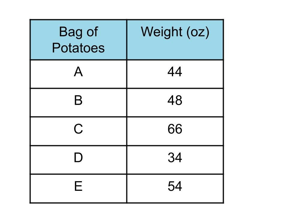Mrs. Baker is throwing a baked potato party. She buys two bags of potatoes that have a combined weight of 100 ounce. Which two potato bags does she buy?