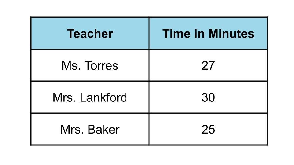 Ms. Torres, Mrs. Lankford, and Mrs. Baker are working on lesson plans for the third grade students at JKB. What is the total amount of time it takes them to finish making the plans?Write your answer in minutes and then convert to hours and minutes.