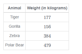 The table shows the weights of the animals at the local zoo. What is the total weight of the tiger, gorilla, and polar bear?