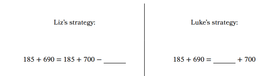 Miss Wong asks her class to find 185 . + 690 Parts of Liz’s and Luke’s strategies are shown. Fill in the blanks to complete Liz’s and Luke’s strategies.