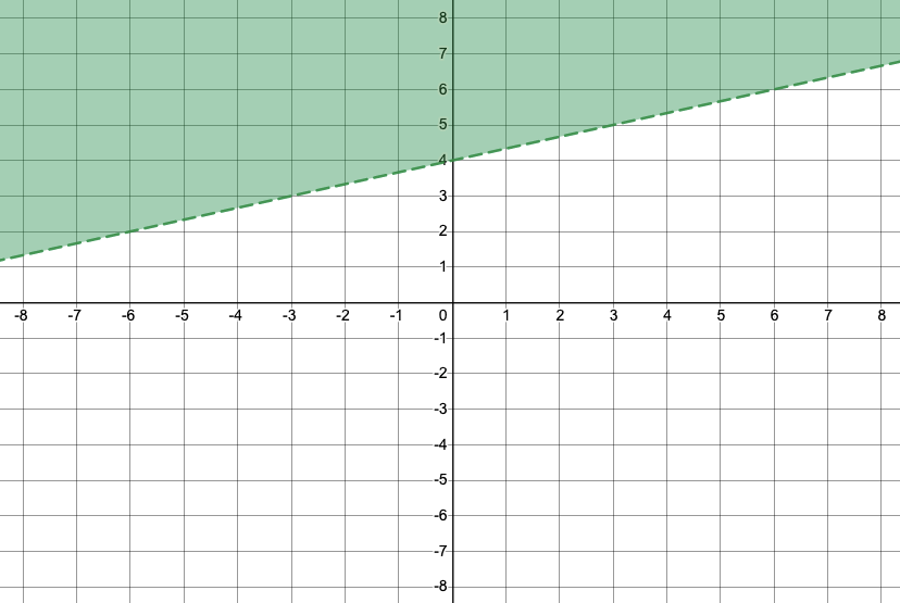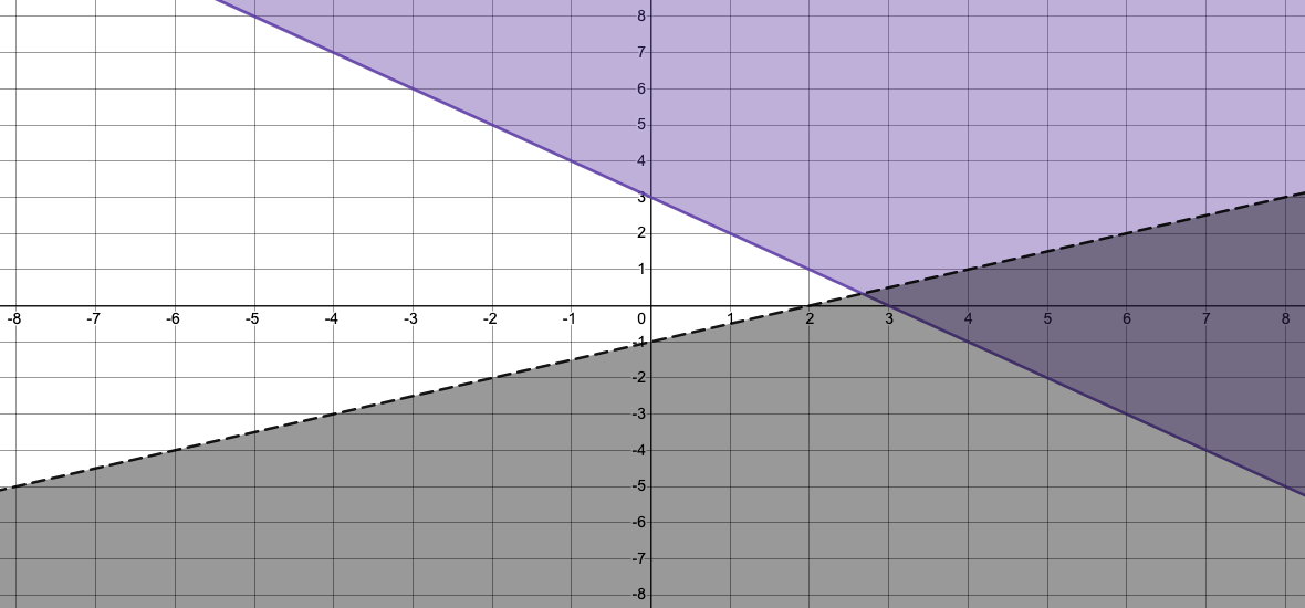 The graph of the system of inequalities  y>=-x+3 and y<1/2x-1 .