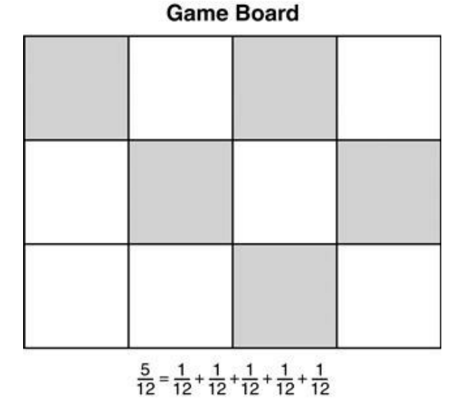 A game board is divided into equal squares. Chayden wrote the equation shown under the game board to represent the shaded parts.