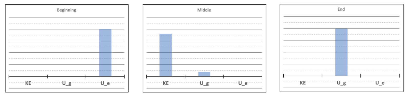 Example: a rock is loaded into a slingshot (beginning), launched straight upwards (middle), and reaches its highest point (end)