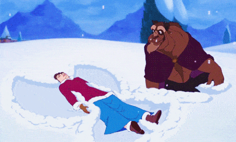 Belle is making a snow angel with the Beast outside on a snowy winter day because she likes snow angels.