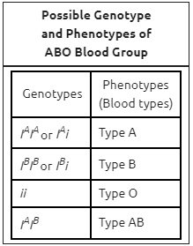 The ABO blood group has three different alleles: IA, IB, and i. The genotypes and phenotypes (blood types) for different combinations of the three alleles are shown in the table.