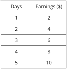 Todos los días, los padres de Sam le dan $2 de mesada. Crea una tabla para representar las ganancias totales de Sam después de cada día.