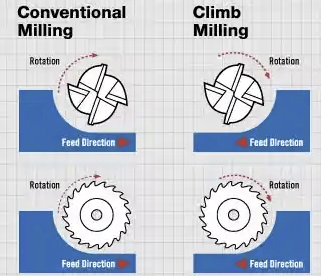 For most cuts, the milling process where the cutting tool moves against the feed direction of the material is desired. This is called "what" type of milling.
