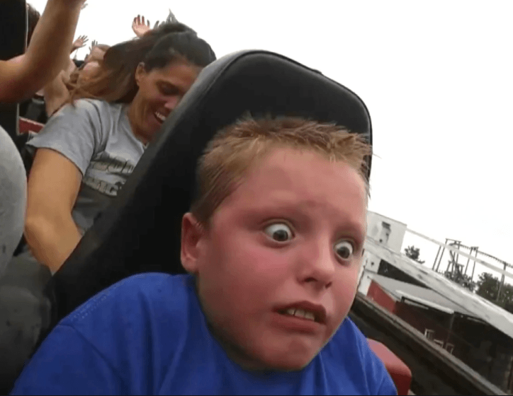 What can you infer about this child's opinion of riding rollercoasters?