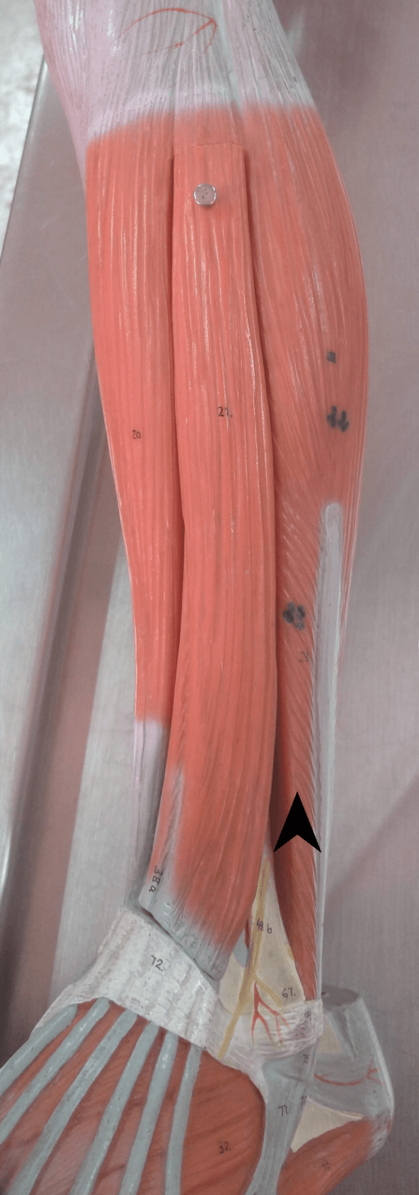 Seu tendão de inserção passa pelo maléolo lateral, cruza pra medial e se fixa no I metatarso