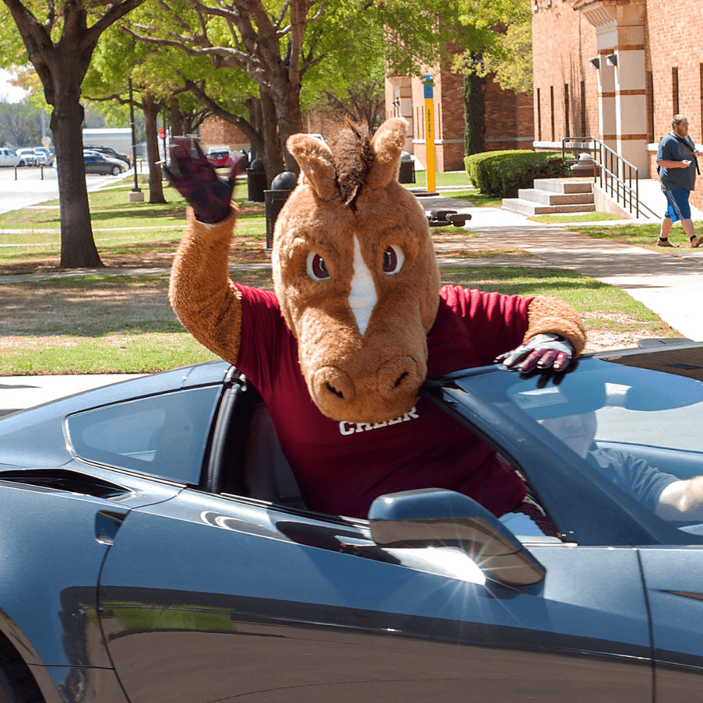 A perpetual sophomore at MSU Texas. He is known for wild antics at football and basketball games where he is known to fire-up the crowd to cheer the Mustangs to victory