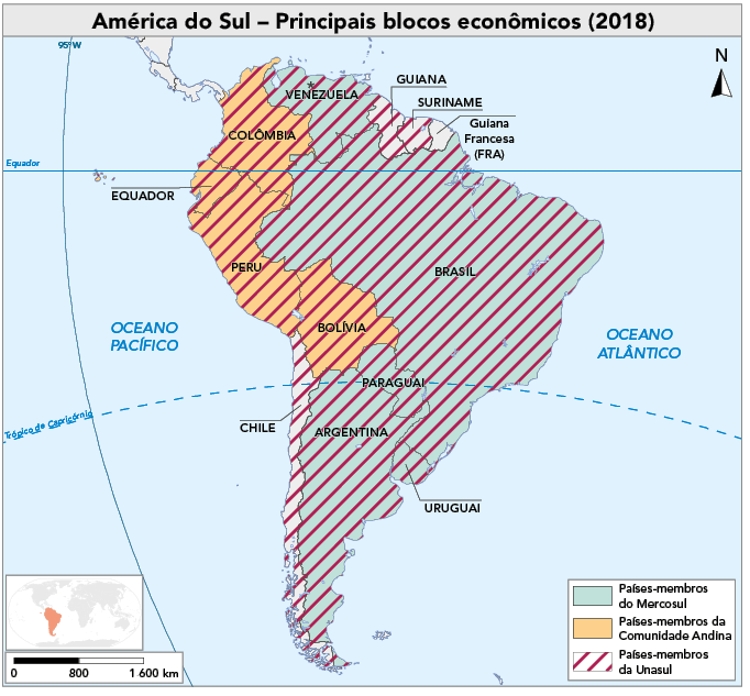 De quais blocos econômicos sul-americanos indicados no mapa o Brasil faz parte?