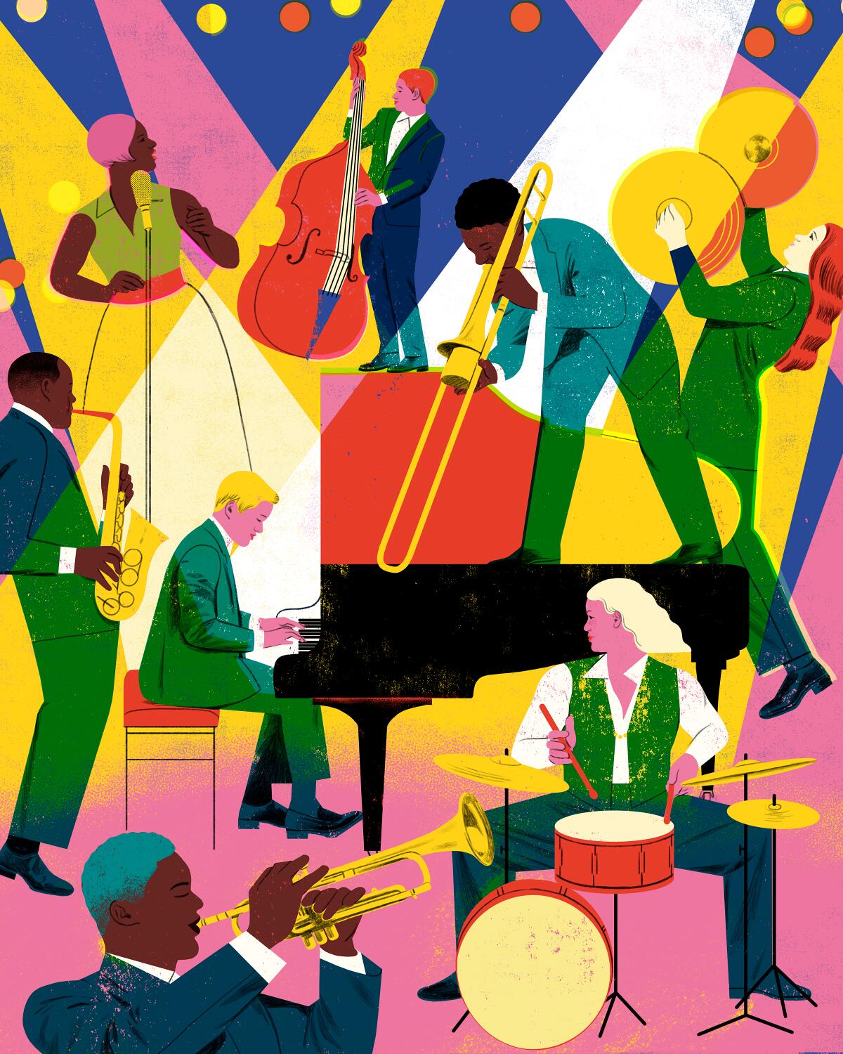 A genre of music that featured musicians like Louie Armstrong and Miles Davis; it uses drums, horns, bass, piano, and other instruments and has a "swing" to it!