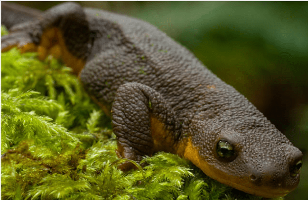 Orange underbelly is a warning to predators that the newt is poisonous and the brown back helps the Newt camouflage with the forest floor.