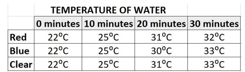 A student wanted to see if the color of water impacted the increase in temperature, in degrees Celsius, after 30 minutes in the Sun. Three beakers were filled with 50 milliliters of water, and five drops of food coloring were added to each beaker. The beakers were then placed on a window ledge in direct sunlight and temperature readings were recorded every 10 minutes for 30 minutes.