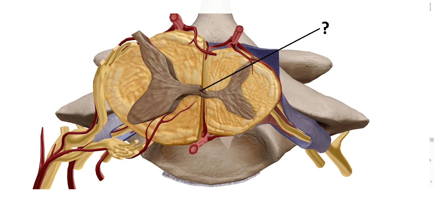 Seen at the pointer, it is the area of the spinal cord that contains CSF.