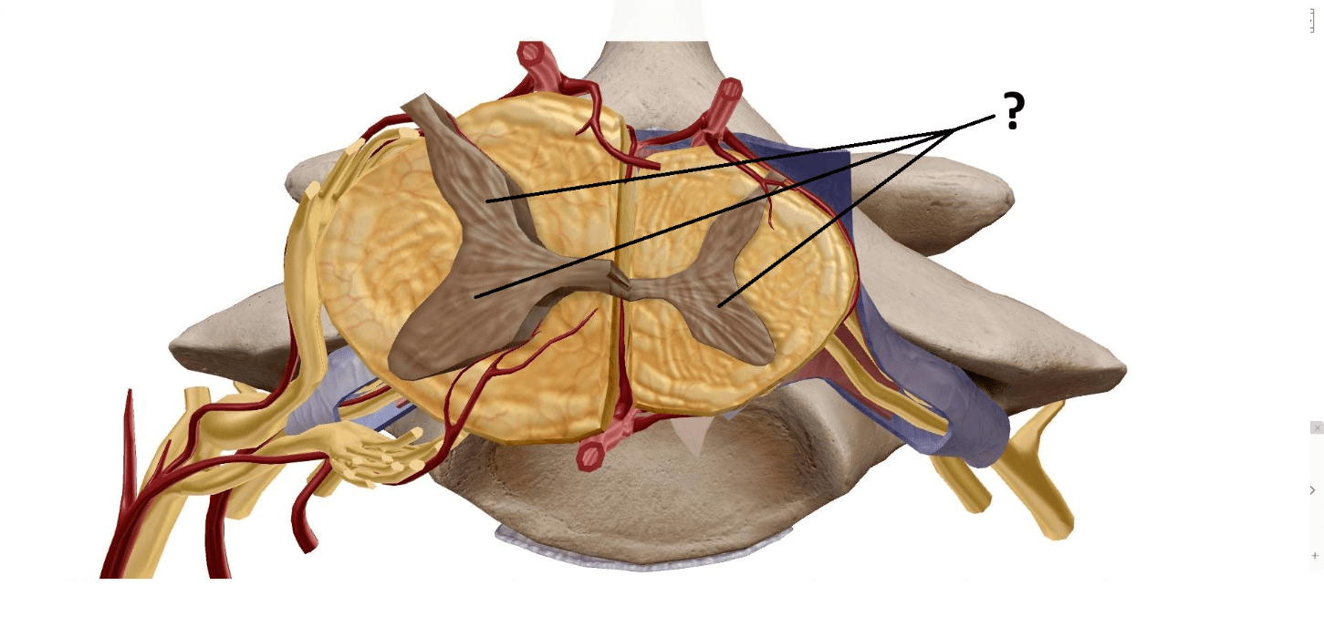 Seen here, it is the butterfly shaped, dark area of the spinal cord cross section.