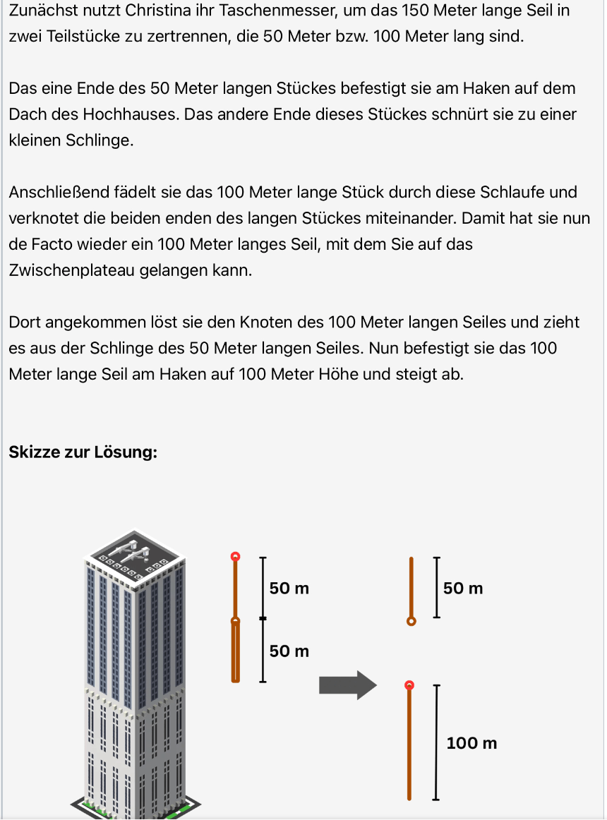 Diese Lösung ist auf den ersten Blick eventuell nicht ganz offensichtlich. Hat man die Lösungsstrategie jedoch einmal gesehen, sind die Rechnung und das Ergebnis leicht nachzuvollziehen.