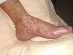 What is Paralysis, usually of the lower extremities (I'll also accept hearing loss although it is less common.) The patient is suffering from Rocky Mountain Spotted Fever as noted by the peripheral rash that moves inward. Of Note only 60% of patients remember a tick bite.