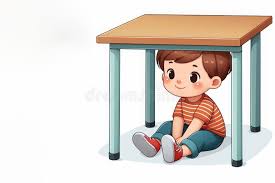 Where is the boy? The boy is ______ the table.