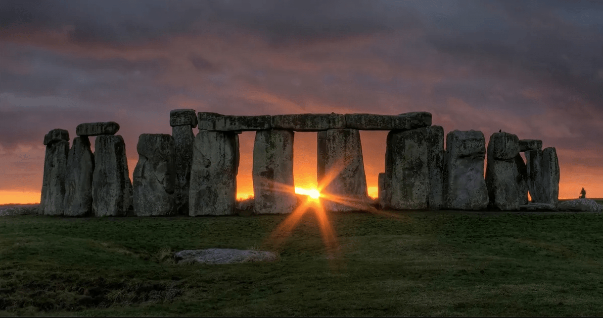 What neolitiic stone monument in Engalnd is aligned with the sunset of Winter Solstice