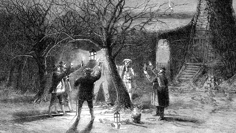 An old British tradition of wishing good health to apple trees by drinking cider, putting toast on branches, and parading while yelling this old English word for "be healthy"