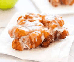 A deep fried doughnut-like dessert filled with apples and cinnamon with a sugar glaze.