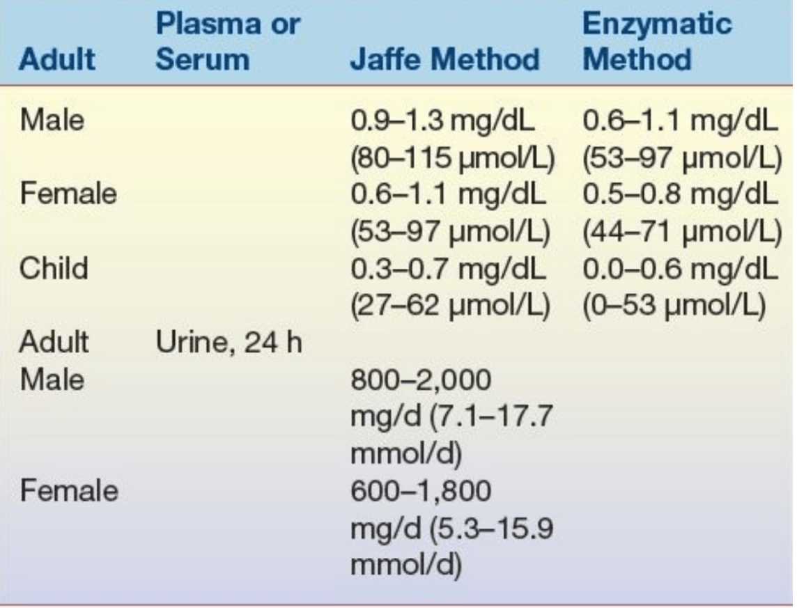Creatinine: 1.0 mg/dL (normal)