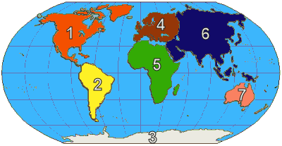 Asia, Africa, North America, South America, Antarctica, Europe, Australia