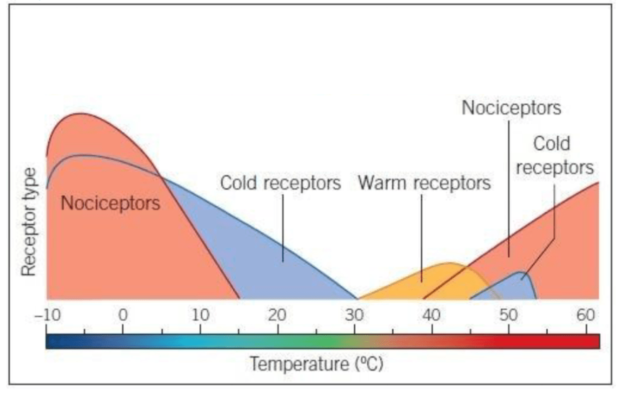 Looking at the graph, this mixed pattern of activation mimics what normally happens around ~45°C, a temperature that also activates heat-nociceptors. The brain interprets this combined signal the same way it interprets noxious heat.