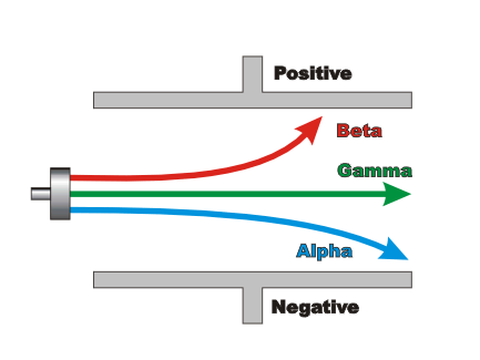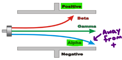 Which nuclear particle bends away from the positive plate in a magnetic field?