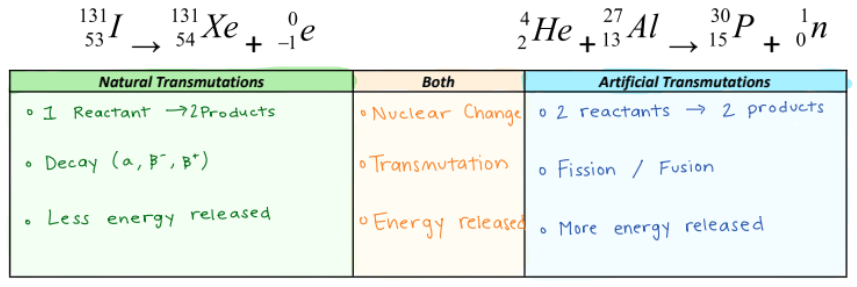 In nuclear reactions the mass and charge of the reactants and products are equal as the law of conservation states that mass and charge cannot be created or destroyed.