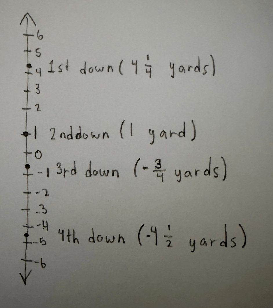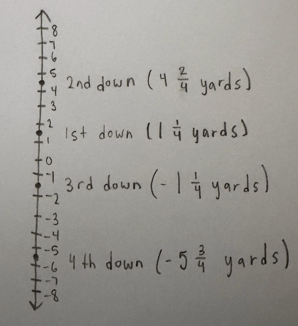 The number line shows the yards gained or lost by a team during a football game. Enter the difference, in yards, between the first down and fourth down.