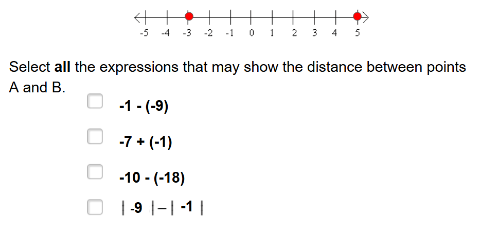 Select all the expressions that may show the distance between points A and B.