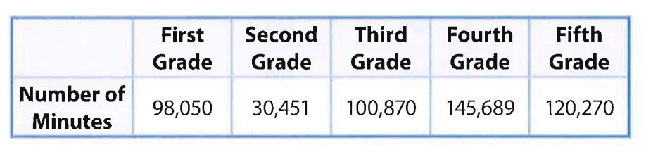 Rounded to the nearest hundred, this is the difference in the number of minutes read by the grade level with the highest total and the grade level with the least total.