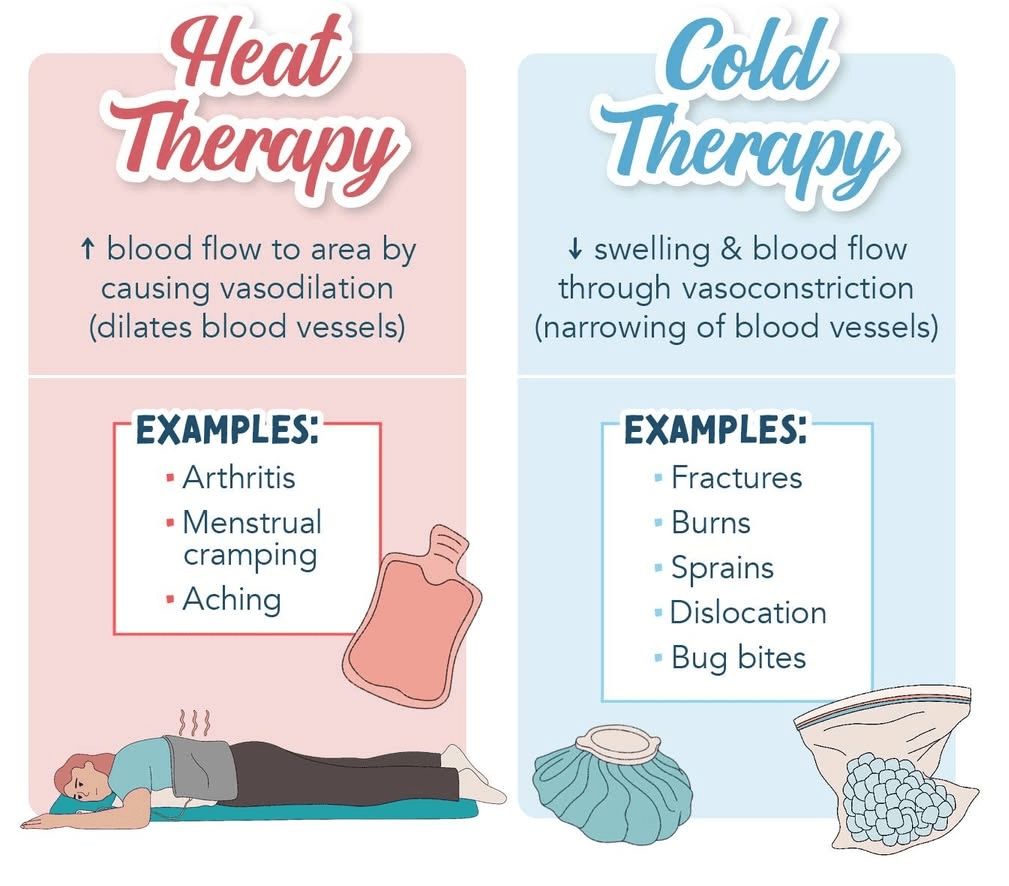 Cold pack for acute injuries/reduces swelling; Hot pack for chronic pain/relaxes muscles