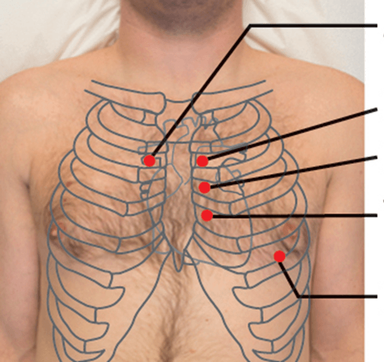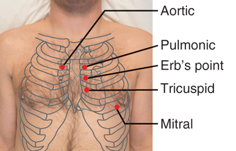 §Left sternal border (LSB), 3rd intercostal space (ICS) (Erb’s point)