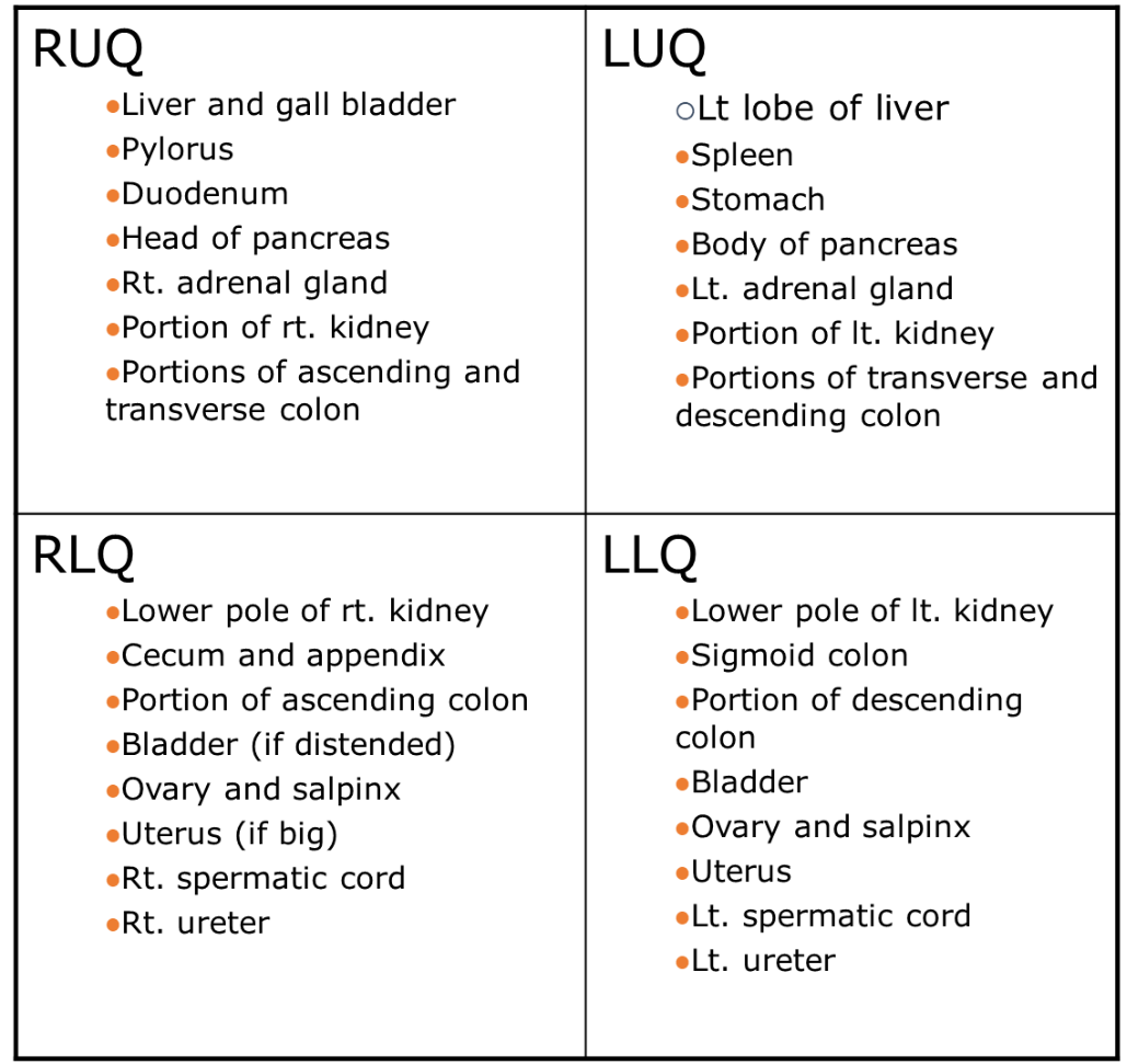 Know what you are assessing for in each quadrant and abnormalities within each quadrant