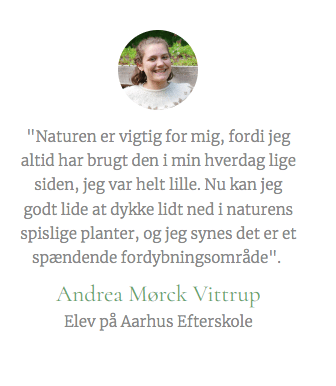 "Naturen er vigtig for mig, fordi jeg altid har brugt den i min hverdag lige siden, jeg var helt lille. Nu kan jeg godt lide at dykke lidt ned i naturens spislige planter, og jeg synes det er et spændende fordybningsområde".<3