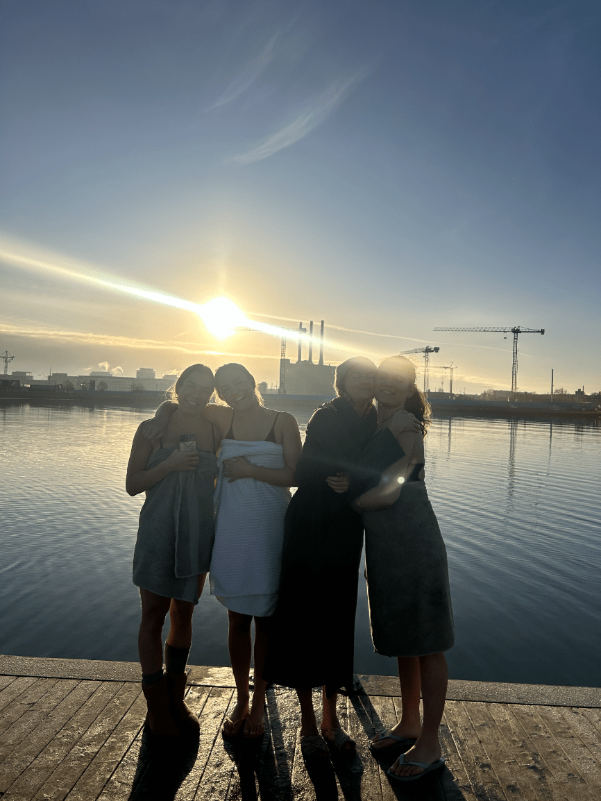 Hvilke bikinier og fodtøj havde vi hver især på til vores 2026 morgenbadning? <3