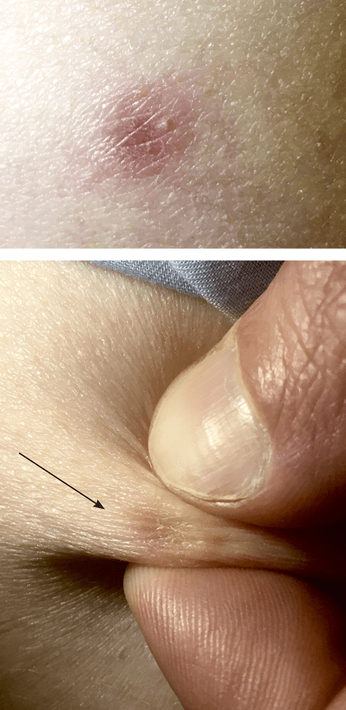 Dermatofibromas originate from a dermal proliferation of fibroblasts after minor trauma, insect bites, viral infections, ruptured cysts, or folliculitis. They typically present as a solitary, firm, often hyperpigmented, 3- to 10-mm nodule and may be pruritic.