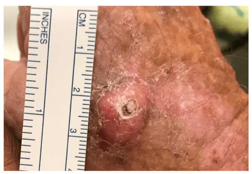 A keratoacanthoma is a dome-shaped nodule with a central crater and can be difficult to distinguish from squamous cell carcinomas even with dermoscopy. Because of this, they should be excised with 5 mm margins. These are most commonly on sun exposed areas of arms and legs.