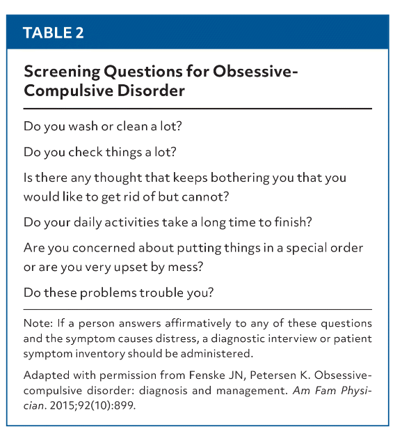 Name a validated tool for OCD diagnosis and at least 2 screening questions