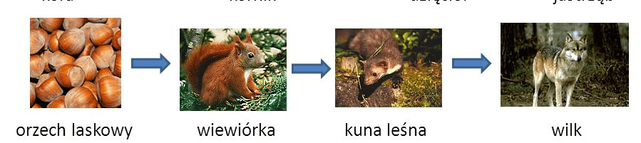 Spośród podanych nazw organizmów ułóż prawidłowy łańcuch pokarmowy: