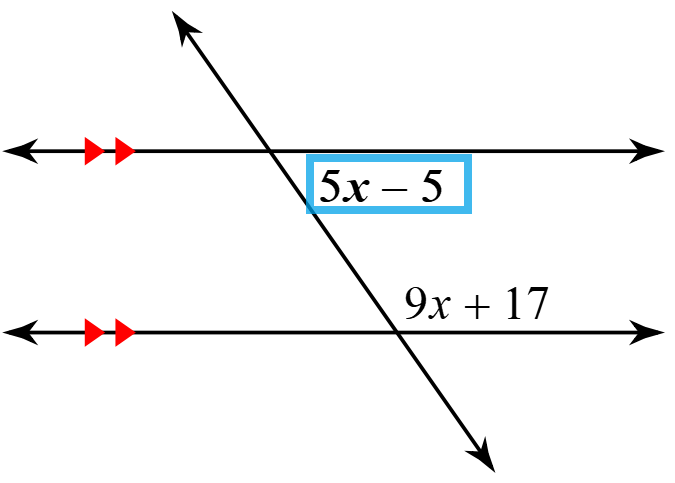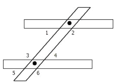 John nailed a piece of wood across two beams as shown. Which angles need to be congruent to show the beams are parallel?